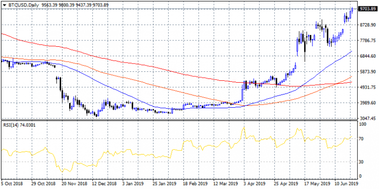 - Βitcoin (BTCUSD) continues higher for one more day breaking above the 9,500 mark at 9,800 making 2019 new high and retreated fast to 9,700