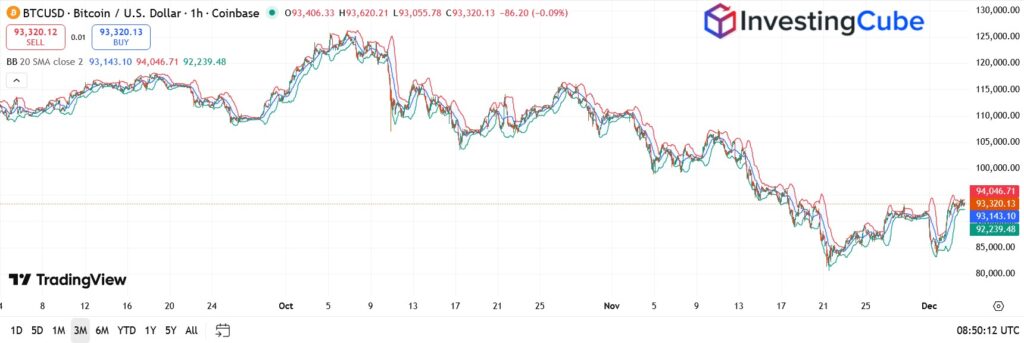 The BTC/USD 1-hour chart shows Bitcoin trading around $93,320, recovering from the early-December bounce after dipping toward $85,000 late last week. Prices remain trapped below the 20-period Bollinger mid-band, which sits around $94,000, a level BTC must reclaim to confirm bullish momentum.