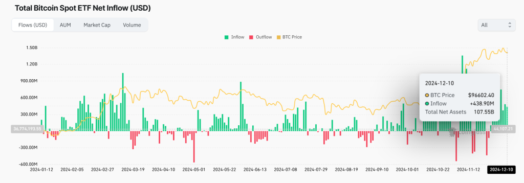 Nonetheless, the prevailing market sentiment is still largely pro-Bitcoin, and the current consolidation is driven by profit-taking. Also, Coinglass data shows that Bitcoin Spot ETF continues to record net positive inflows despite the recent decline in the price. That signals investor confidence in the coin’s upside potential.