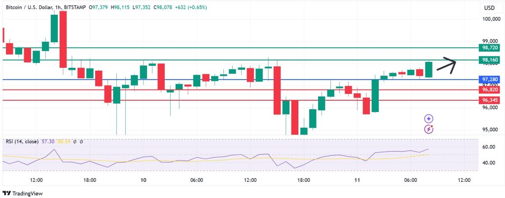 Resistance: Immediate resistance will likely be at $98,160. However, a stronger upside momentum will breach that barrier and potentially test $98,720.