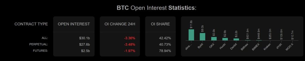 Inclination to Bitcoin price downside is also supported by a decline in the open interest. According to Coinanalyze data, the value of BTC open interest perpetual contracts fell by 3.48% in the 24 hours preceding this writing. Similarly, futures contracts were down by 1.97%.