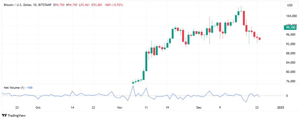 BTC’s downside is exacerbated by decreased ETF performance. The 11Bitcoin ETFs traded in the United States recorded $227 million in net outflow on December 23rd, signaling weakening investor confidence in the asset’s upside potential.