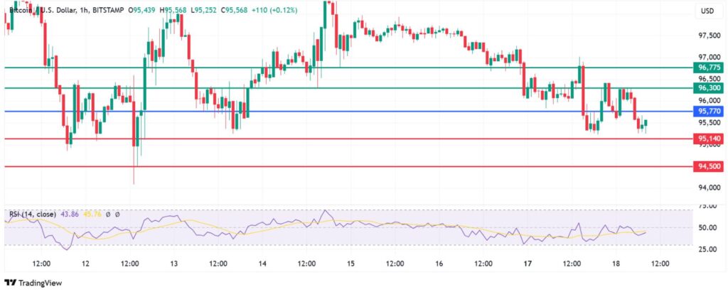 Bitcoin price pivots at $95,770, and the RSI indicator favours the sellers’ being in control. The BTCUSD pair will likely go lower to the first support at $95,140. A stronger momentum will break below that level and could test the second support at $94,500.