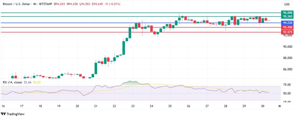 The momentum on Bitcoin price signals bullish control above the pivot mark at $94,220. That trend will likely meet the first resistance at $95,365. However, an extended control by the buyers will break above that level, potentially pushing the price to test the psychological hurdle at $96,000.