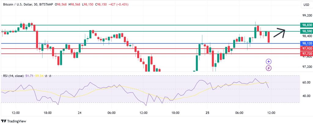 The momentum on Bitcoin price favours the continuation of the upside if action stays above the pivot mark at 98,120. With that, the price is likely to move further up to 98,590, where it could meet the first resistance. Extended control by the buyers will break above that level and could send BTC higher to test 98,830.