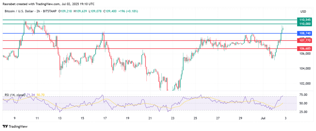 The momentum on Bitcoin price calls for further upside above $108,740. That will likely meet initial resistance at $110,000. Breaking above that level will signal a strong momentum that could send the action higher and test the second hurdle at $110,545.
