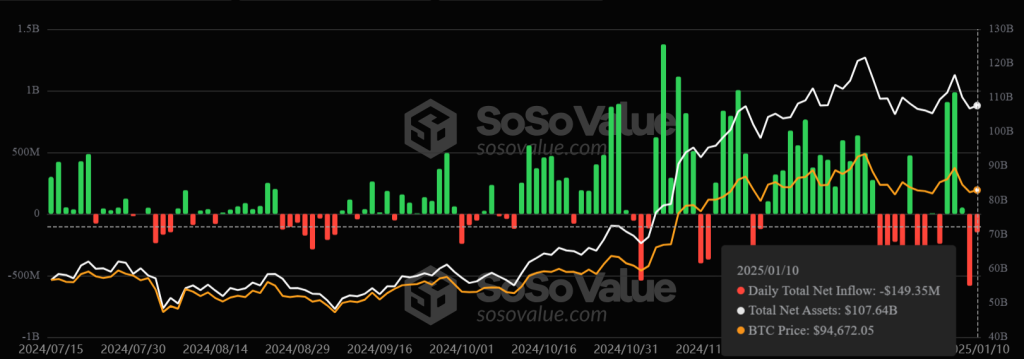 Also, Bitcoin’s ETF performance declined significantly in the last two sessions. According to data analysis site, SoSoValue, spot Bitcoin ETFs recorded net outflows of -$149 million and -$582 million on January 10th and 8th, respectively. A continuation of the trend could add downward pressure on Bitcoin price.