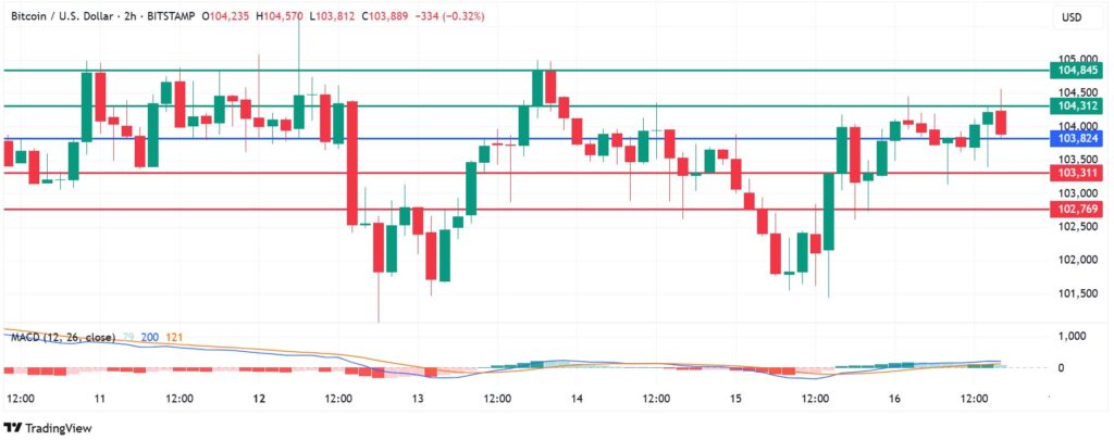 The momentum on Bitcoin price calls for an extended control by the buyers above $103,824. The coin will likely meet initial resistance at $104,312. A stronger upward momentum will break above that level and potentially extend gains to test the second barrier at $104,845.