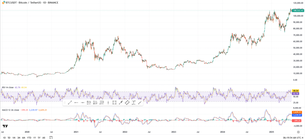 Bitcoin’s run is cooling off, not crashing, just slowing. After weeks of grinding higher, BTC is now hovering just below $110,000, and it’s starting to look a little tired. You can see it on the chart. Momentum’s still there, but it’s not charging like it was earlier this month. The price keeps nudging that $110K zone, but no real follow-through. Right now, it’s acting more like resistance than a launchpad.
