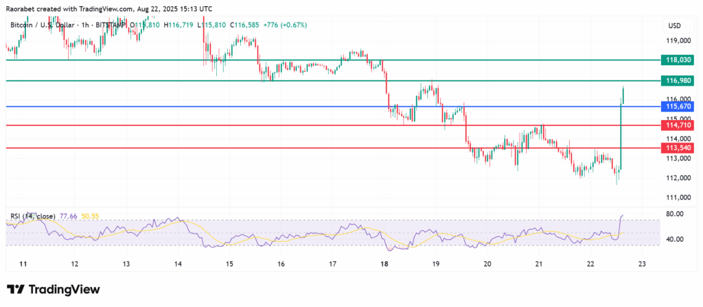 Bitcoin price pivot mark is at $115,670 and the coin will need to stay above that level to maintain the upside traction. With the buyers in control, BTC will likely find initial resistance at $116,980. Breaking above that level will signal a stronger momentum that could extend gains to test $118,030.