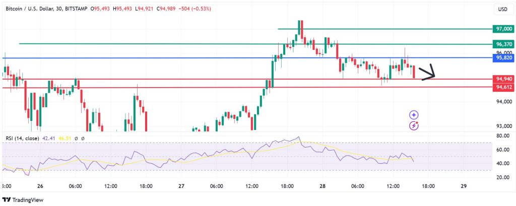 Bitcoin price pivots at $95,820, and the momentum indicator signals bearish control. That is likely to establish the first support at $94,940. A stronger downward momentum will break below that mark and potentially test $94,612.