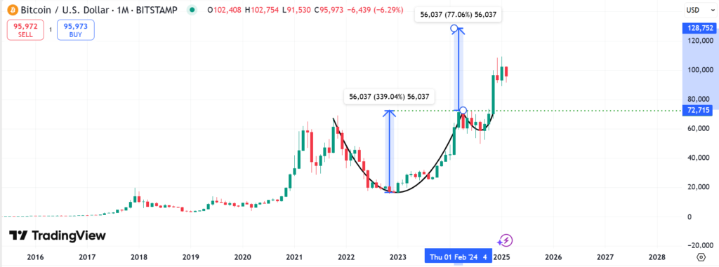 Also, BTCUSD has broken upwards on the monthly chart after previously forming a bullish cup-and-handle pattern. Using the cup’s depth as the yardstick to measure the price target suggests that BTC price could rise to highs of $128,752 in the next few months. That translates to a 34% upside on the current price.
