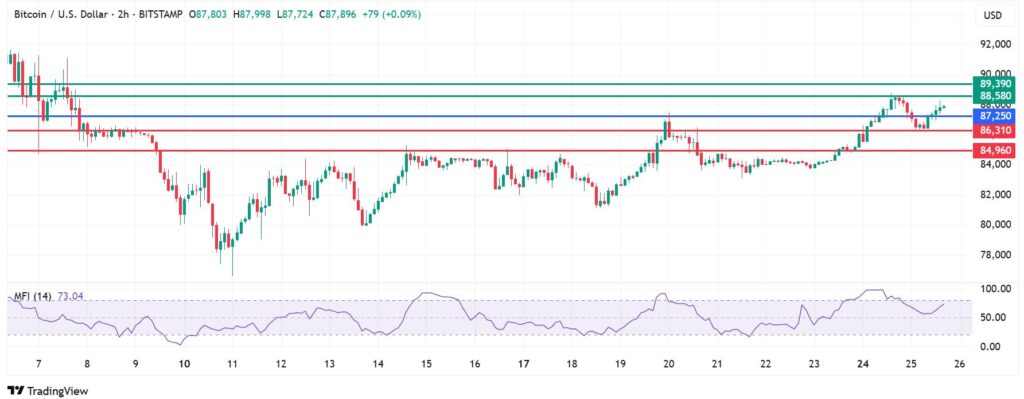 The momentum on Bitcoin price has seen its pivot move to $87,250. The upside will likely continue if action stays above that level. With the buyers in control, the coin will likely rise further to encounter the first resistance at $88,580. However, a stronger upward push will break above that barrier and test $89,390.
