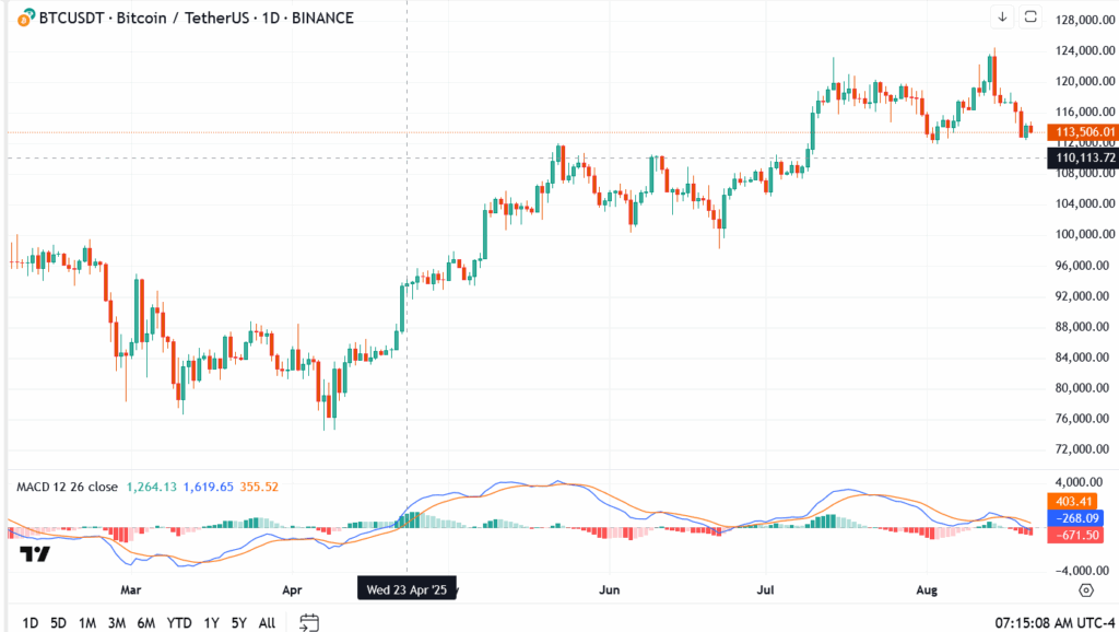 BTC is parked just above its $113,000 pivot. A close above $116,000 would relieve immediate pressure and open the path back to $120,000. Lose $113,000, however, and the market will quickly probe $112,000, with $110,000 as the next line of defense. The MACD remains soft, signaling consolidation rather than momentum.