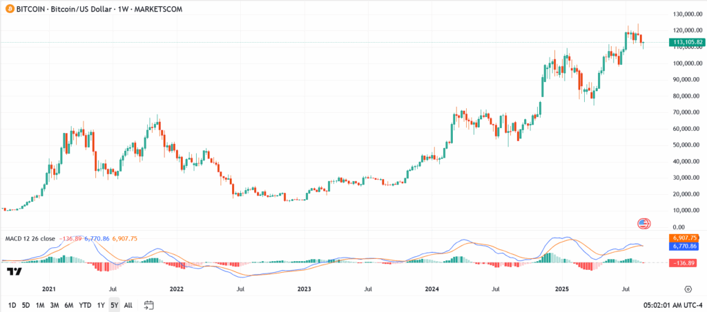 On the weekly timeframe, BTC is still printing higher highs and higher lows compared with the spring trough. Price is holding above the prior breakout area near $110K, which now acts as first support, with a deeper shelf around $105K and the psychological $100K level below that. Resistance is stacked at $120K, then $125K, followed by the year-to-date peak just shy of $130K. The MACD has eased from extreme readings, and the histogram has begun to contract, which often signals waning downside pressure rather than a fresh bearish leg. If buyers can keep weekly closes above $110K, the path back toward $120K reopens.
