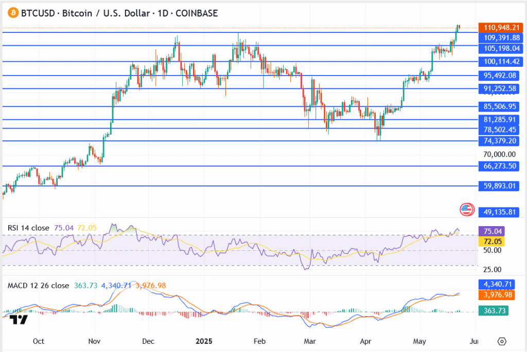 Bitcoin made headlines, hitting a new record high of $112,000 before easing back a bit. As of now, it’s hovering around $110,900, still an impressive level that’s keeping traders on edge. The breakout has pushed Bitcoin’s market cap past the GDP of entire nations, including Sweden and Saudi Arabia, and left traders wondering: Is this just the beginning?