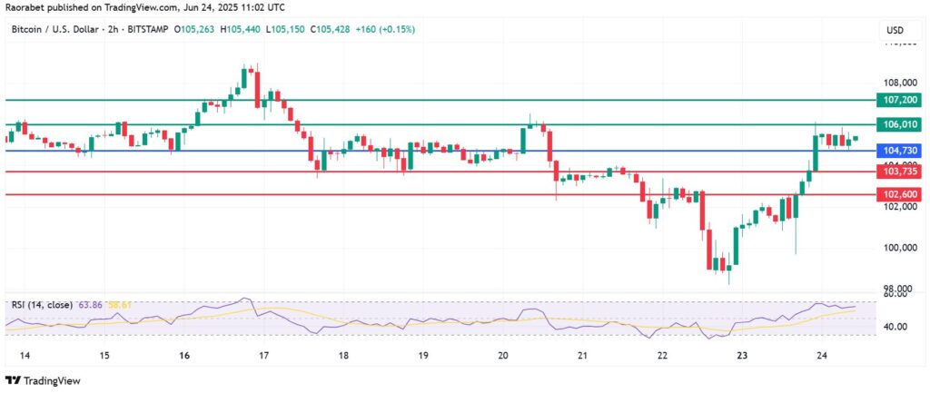 The momentum on Bitcoin price favours the buyers to be in control if action stays above $104,730. That will likely result in upward movement to find initial resistance at $106,010. However, a stronger momentum will break above that level and could test the second resistance at $107,200.