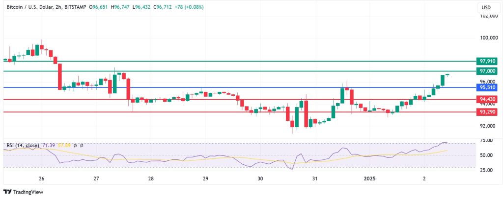 Bitcoin price pivots at $95,510 and the momentum indicator favours the continuation of the upside. That will likely see the coin move to the first resistance at $97,000. However, a stronger upside momentum could breach that barrier and potentially test $97,910.