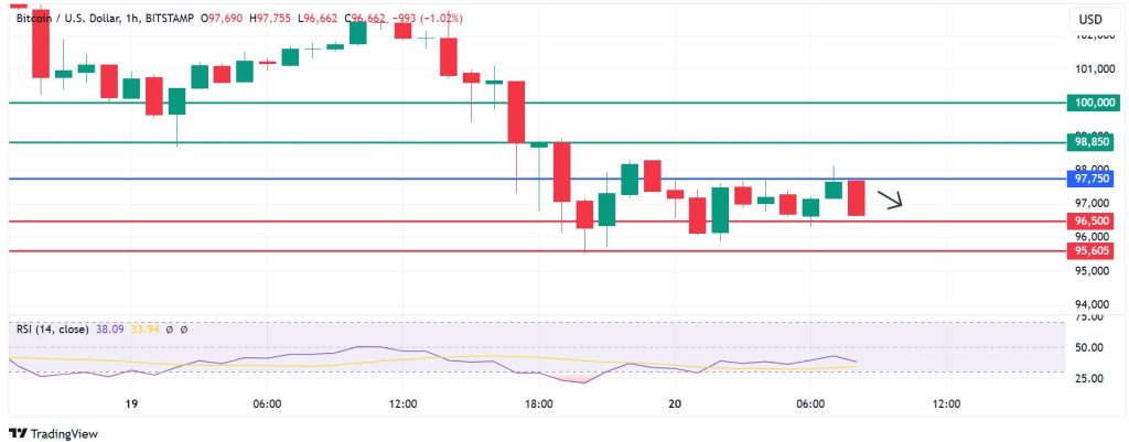Bitcoin price pivots at $97,750 and the sellers are currently in control as signaled by the RSI indicator. The downward trajectory will likely prevail if resistance persists at the pivot. With the sellers in control, the first support will likely be at $96,500. However, a stronger downward momentum could break below that level and test 95,605.