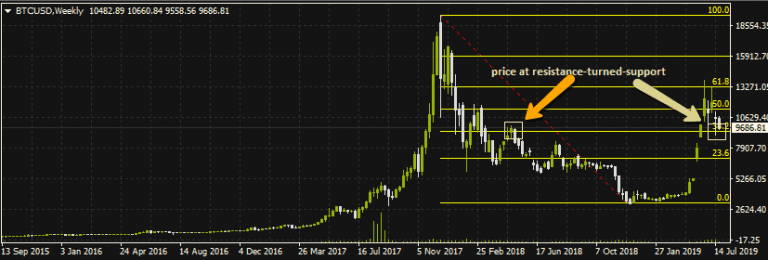 BTCUSD is presently trading at around $9,700 and can be seen to be approaching the key support level on the weekly chart that is formed by the 38.2% Fibonacci level. These Fibonacci levels were derived from a trace from the swing high of November 2017 to the swing low of Dec 9 2018. The 38.2% Fibo retracement price level of $9,350 is also seen to be the previous resistance of April 2018 which was surmounted by this year’s crypto surge.