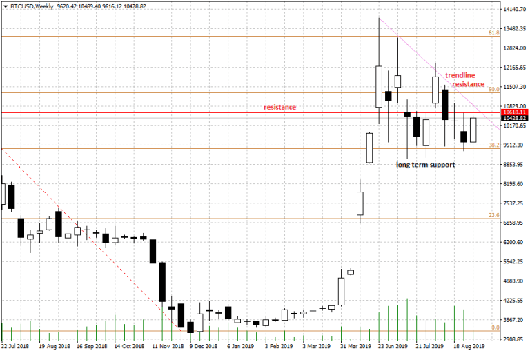Technically speaking, BTCUSD is still in a long-term downtrend; it is yet to reach the all-time highs of November 2017. At the current price of 10,418 (as at the time of writing), BTCUSD is close to testing the long-term resistance at 10,620.