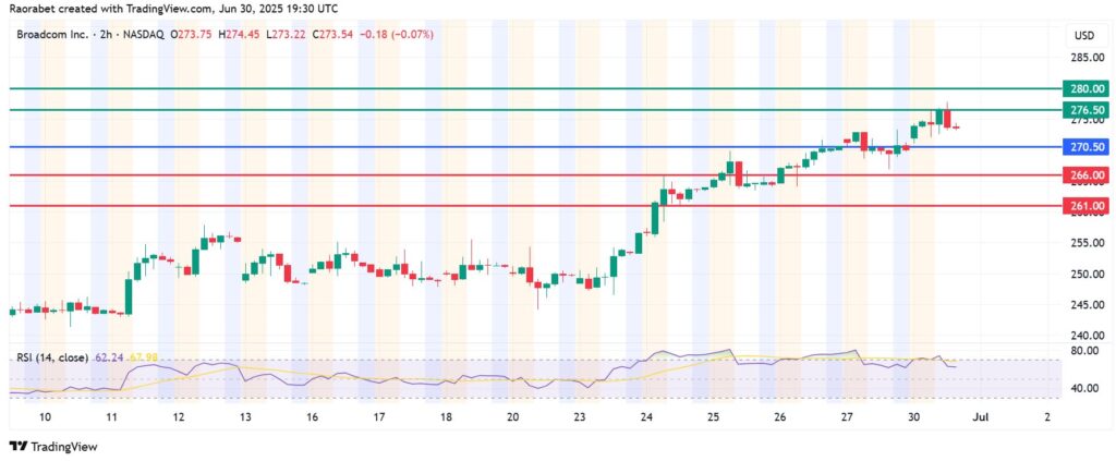 The momentum on Broadcom stock price calls for further upside above the pivot mark at $270.50. That will likely see initial resistance established at $286.50. Breaking above that level will signal a stronger momentum that could extend gains to test $280.