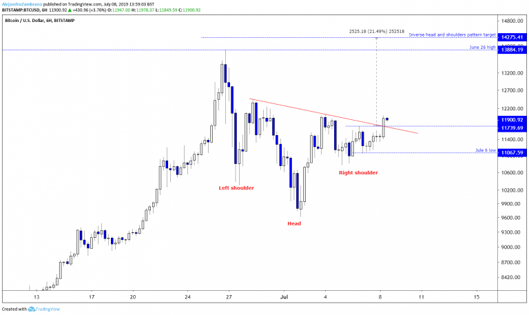 At the time of writing, Bitcoin prices (BTCUSD), appeared to have completed an inverse head and shoulders pattern with a target of $14275. The pattern has been forming since June 26 when bitcoin’s price slid from $13884 to $9620 over five days.