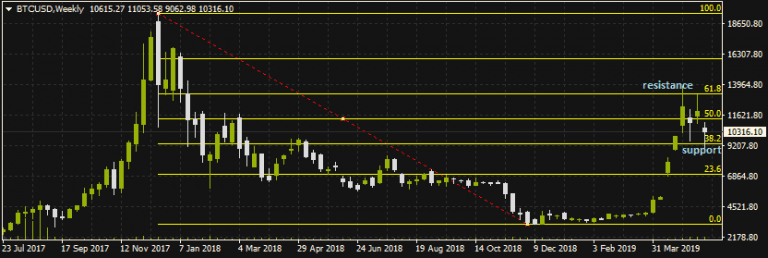 To the upside, we look to see if BTCUSD will breach the 50% Fibonacci level at $11.340. If this level is overcome, then price will start to aim for the 61.8% Fibo level of $13.164.