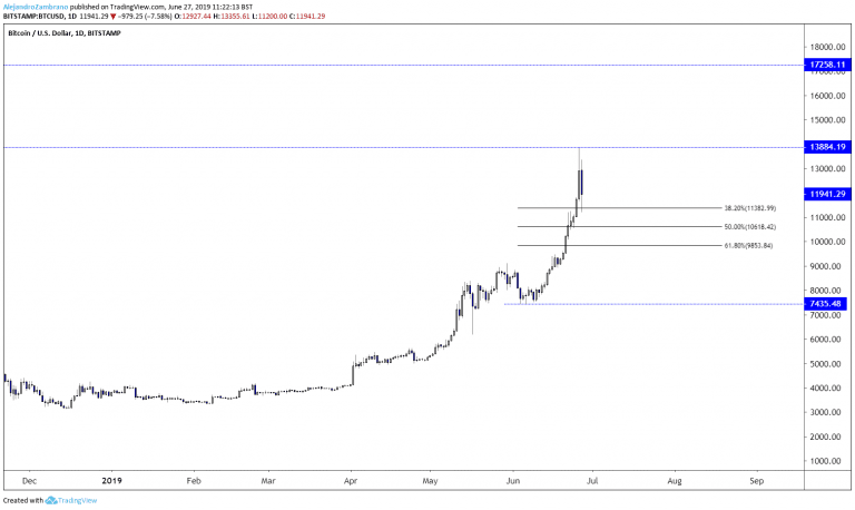 The next few days should be wobbly for investors and price, as some see the latest slide as an opportunity to buy, while some early investors are cashing out on the 2019 rally. However, as long as the price trades above the latest major low and likewise June 4 low of $7435.5 the overall trend in Bitcoin (BTCUSD) will remain bullish. Levels that might offer support to buyers are the three Fibonacci levels of the June rally at $11382, $10618, and $9853, which are the 38.2%, 50%, and 61.8% corrections respectively.