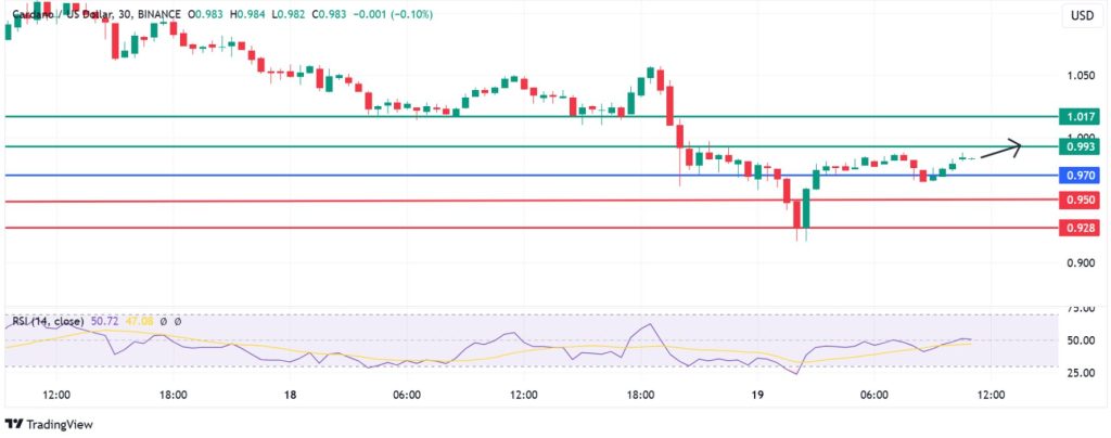 Cardano price pivot mark is at $0.970 and the upside will prevail if action stays above that level. Also, the momentum indicator signals control by the buyers. In that case, the price will likely meet the first resistance at $0.990. However, if the buyers extend their control, ADAUSD could break above that barrier and test $0.100.