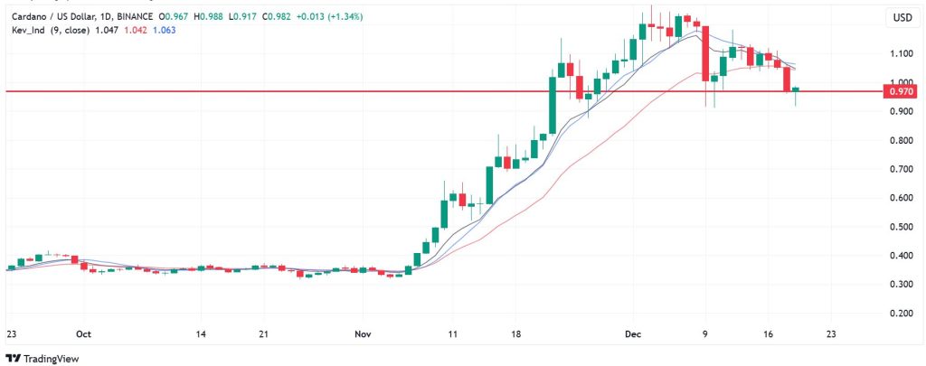 Cardano price broke below the $1 psychological support mark on Thursday as the broader crypto market slumped. ADAUSD traded at $0.973 at the time of writing, having inched up by 0.6%. Nonetheless, the coin has lost 10% of its value in the last week, injecting a sour sentiment in the market.