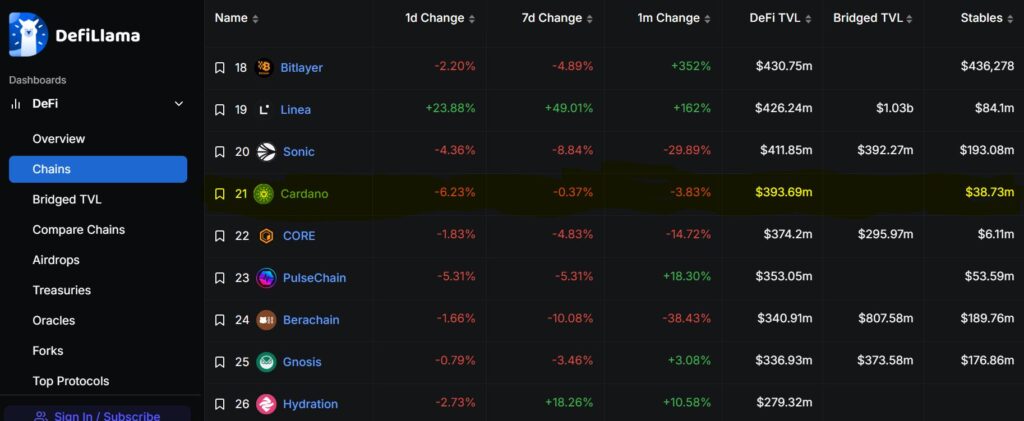 A screen grab of DeFi chain performances with Cardano at position 21. Source: DeFiLlama