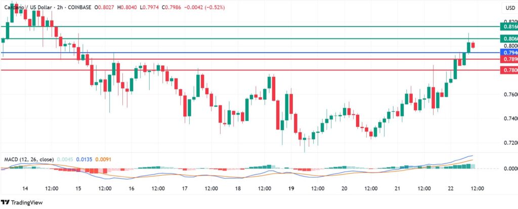 The momentum on Cardano price calls for further upside above $0.794. With the bulls in control, the coin will likely head higher and encounter the first hurdle at $0.806. A stronger momentum will clear that level and could push the price higher to test $0.816.