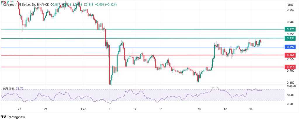 The Money Flow Index (MFI) reading on Cardano price favours the buyers to stay in control above the pivot mark at $0.797. The uptrend will likely meet the first resistance at $0.833. However, an extended control by the buyers will break above that level and potentially test the next hurdle at $0.870.