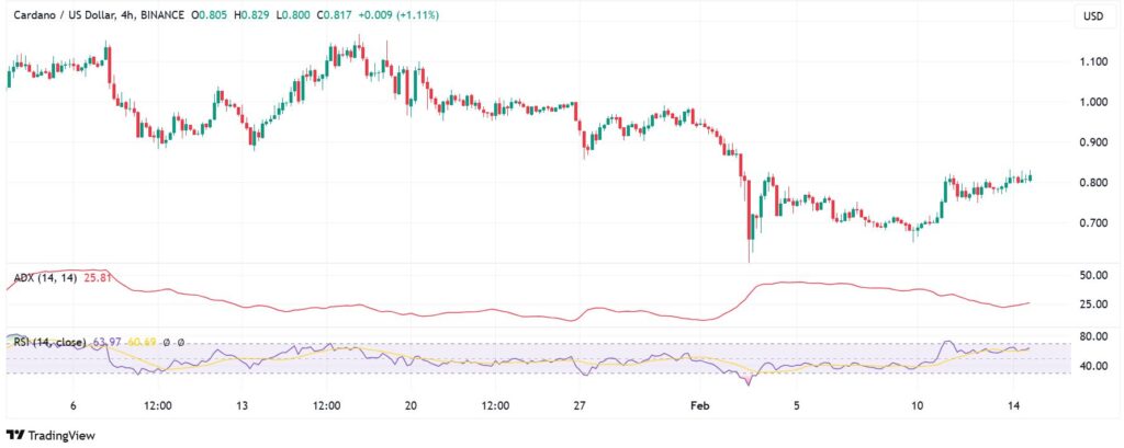 Also, the Average Directional Index (ADX) indicator reading on Cardano price 4-hour chart was at 25.8, while the RSI reading was 63. These indicators show a strong uptrend, adding credence to the likelihood of more gains.