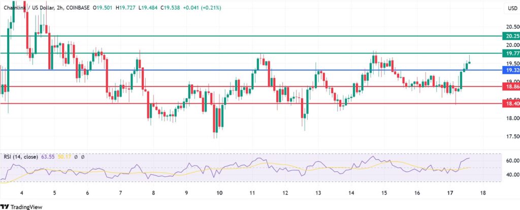 Chainlink price pivots at $19.32 and the momentum favours the buyers to stay in control above that level. The primary resistance is likely to be at $19.77. However, a stronger momentum will break above that level and potentially test the next resistance at $20.25.