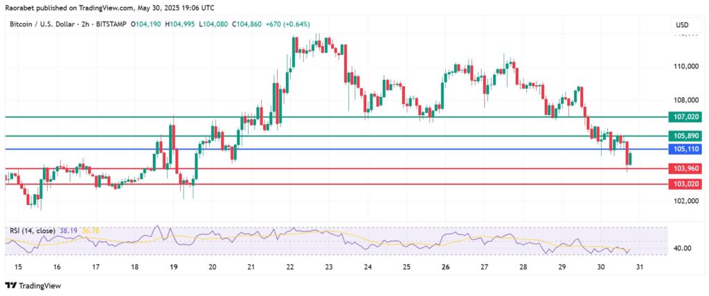 The RSI on Bitcoin price signals that the coin will likely trade downwards if resistance persists below $105,110. That momentum will likely see the first support established at $103,960. However, an extended control by the sellers will break below that level and could send the price lower to test $103,020.