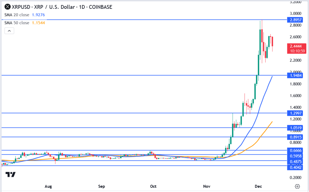 XRP’s price continues to be a strong performer, staying above $2.40 while Ripple modifies its stablecoin schedule. Traders need to keep an eye on additional news regarding Ripple’s stablecoin initiatives and the macroeconomic elements affecting the cryptocurrency market.