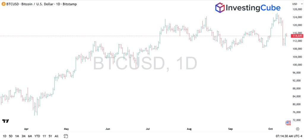 Bitcoin (BTC) is trading near $115,331, up 0.04% over the past 24 hours, as the market digests one of the most turbulent weekends in recent months. After climbing to intraday highs of $115,830, the asset has slipped into a narrow consolidation range, signaling that traders are recalibrating risk exposure before the next directional move. The tone across the market is one of cautious stability, a brief pause in volatility rather than a return to calm.