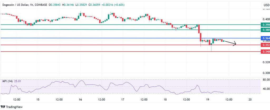 Dogecoin price pivots at $0.364 and the Money Flow Index (MFI) calls for further downside. With the sellers in control, Dogecoin price will likely find the first support at $0.352. However, a stronger downward momentum could break below that level and test $0.340.