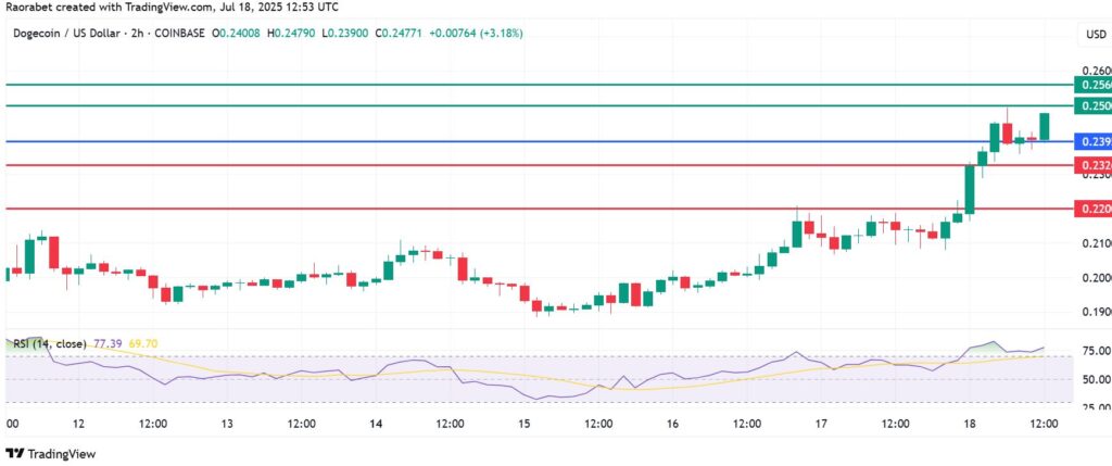 Dogecoin price pivot mark is at $0.239 and the momentum favours the upside to continue. The coin will likely meet initial resistance at $0.250. Breaking above that level will signal a strong momentum that could push the action higher to test $0.256.