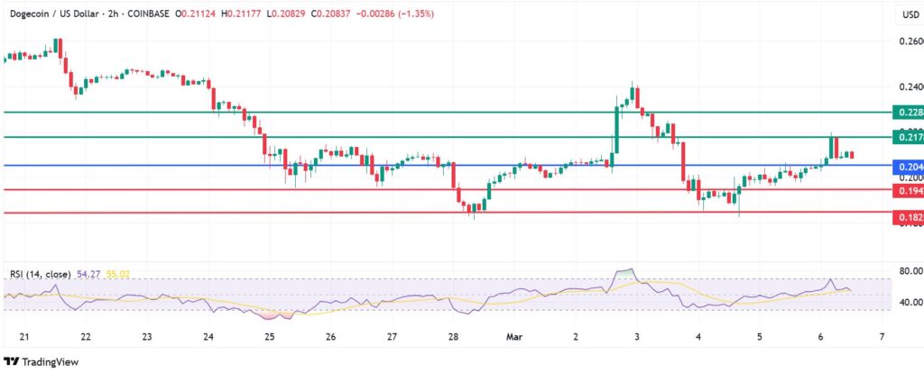 Dogecoin price pivots at $0.207 and action above that level favours the buyers to stay in control. The coin will meet initial resistance at $0.217. However, a stronger momentum will break above that level and potentially test the second resistance at $0.228.