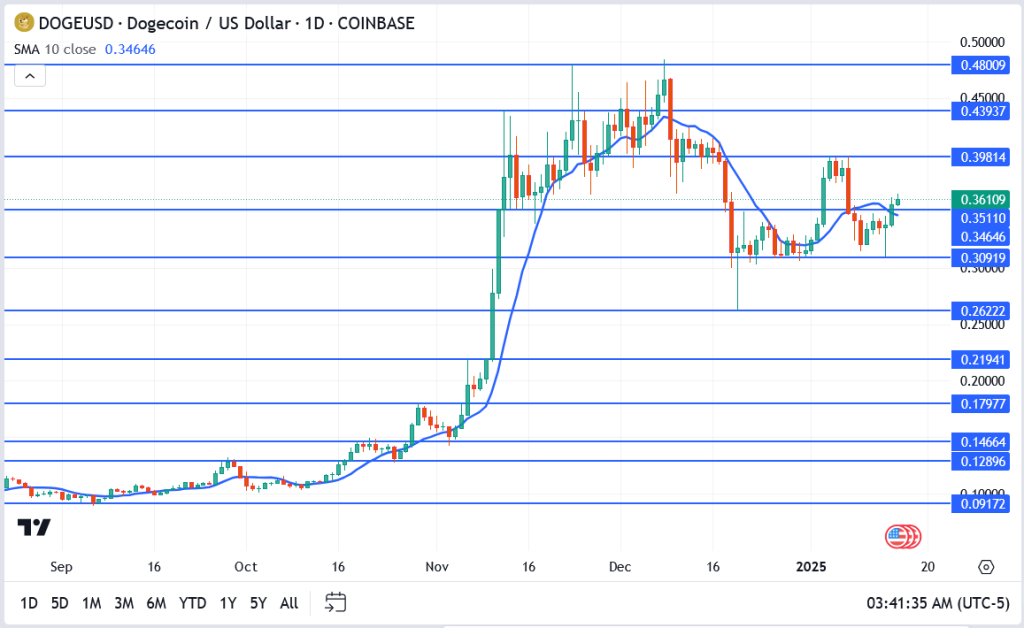 Dogecoin’s (DOGE/USD) price action is regaining traction after weeks of consolidation, with the meme coin attempting to reclaim its former glory. As of January 15, 2025, Dogecoin is trading near $0.3610, supported by a bullish crossover of the 10-day Simple Moving Average (SMA) at $0.3465.