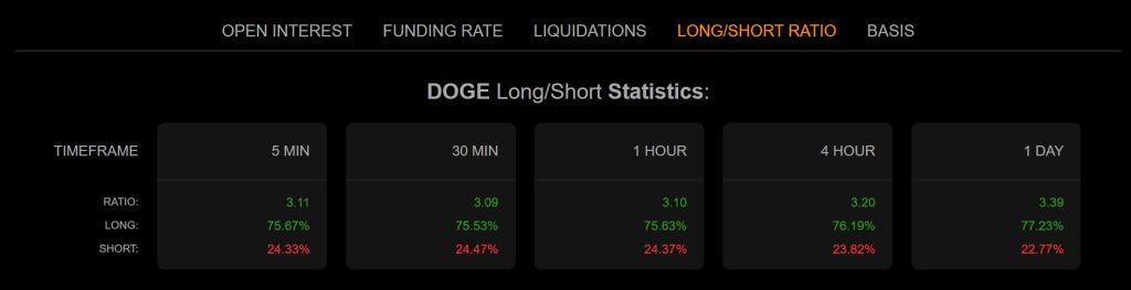 Liquidation data also points to positive investor confidence in Dogecoin price. According to Coinanalyze, DOGE has a 3.39 long/short ratio in the last day. That shows that the value of long (buy) positions far-exceeds that of short (sell) positions on the asset.