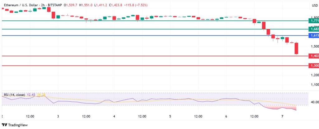 Ethereum price declined further on Monday, mirroring the broader crypto market slump. The coin was down by 6% and traded at $1,483 at press time, with its weekly losses at 17.7%. That performance seems likely to follow the tempo set by the global financial markets, which are on a steep decline in the face of a broadening trade tariff war.