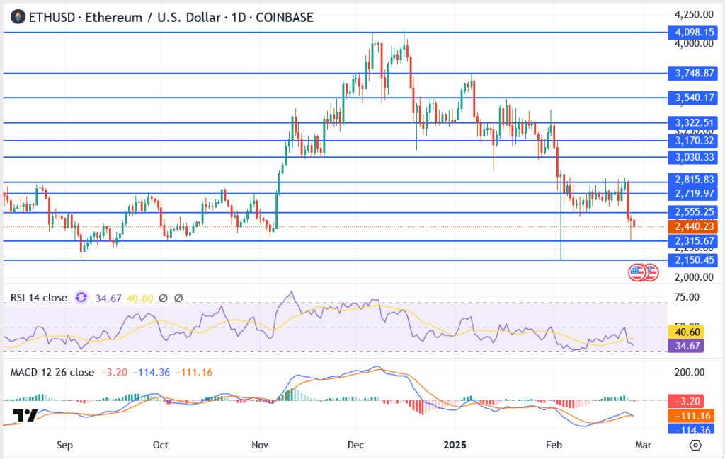Ethereum (ETH) has been caught in a brutal selloff, plunging from $2,815 to as low as $2,315 after a massive $1.5 billion hack on Bybit. On Monday, ETH crashed alongside Bitcoin as panic spread across the market. Yesterday, the price attempted a weak recovery but failed to reclaim key resistance levels, leading to another sharp decline today. With ETH now struggling near $2,440, traders are asking: Is this the bottom, or will Ethereum sink even lower?