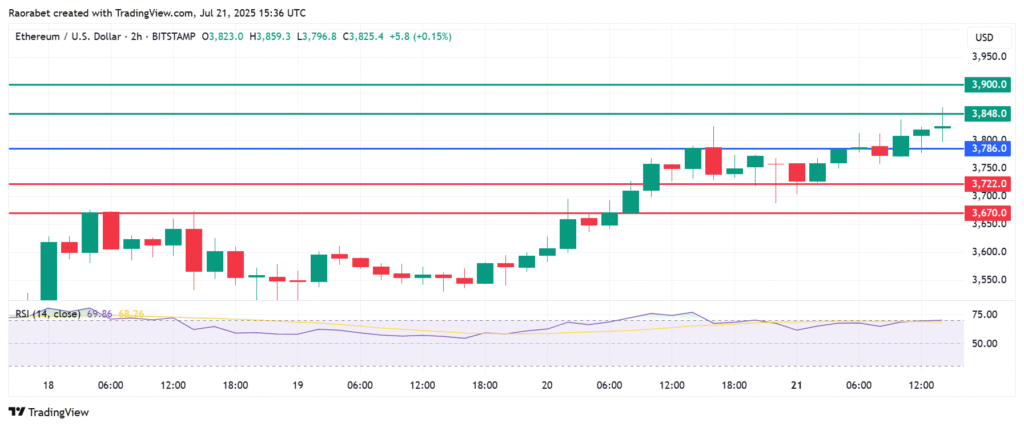 Ethereum price has extended its upside, registering gains for the ninth consecutive day and trading at $3,842 and up by 2.2% at the time of writing. The day also saw the coin hit year-to-ate highs of $3,876, underlining the bullish hold of the momentum. However, its RSI is at 88, denoting overbought conditions, which could limit gains in the coming days.