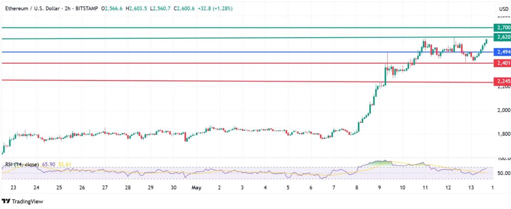 Ethereum price pivots at $2,494 and action above that level favours the buyers to stay in control. The upside momentum will likely meet initial resistance at $2,620. However, an extended control by the buyers will breach that mark and could send the ETHUSD pair higher to test $2,700.