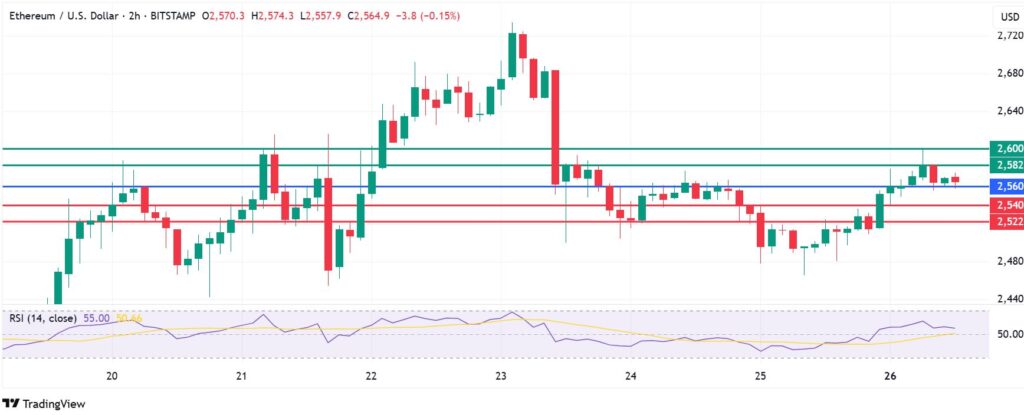 Ethereum price momentum favours it to stay on the upward trajectory above $2,560. With the buyers in control, the first barrier will likely be at $2,582. However, a stronger momentum will break above that level and potentially send the price to test $2,600.