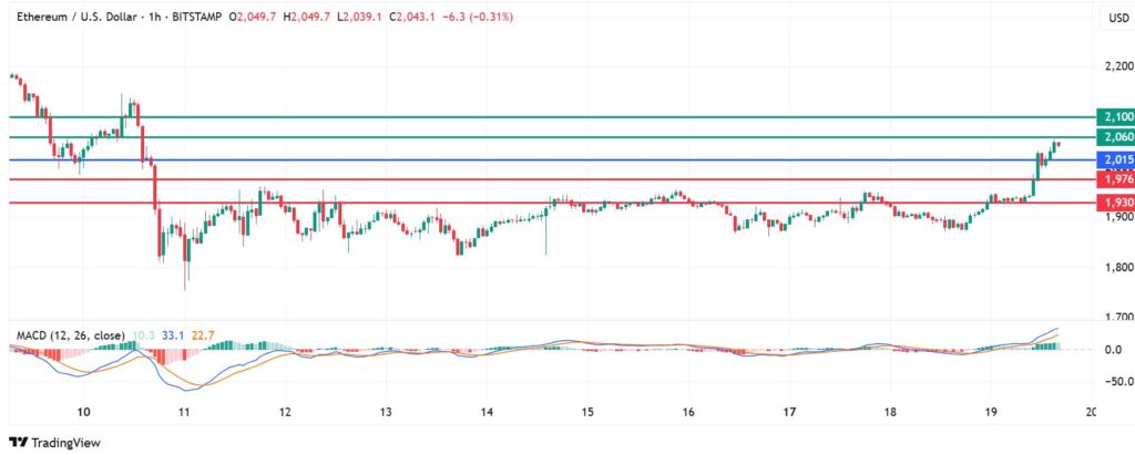 Ethereum price pivots at $2,015 and the upside will continue if action stays above that level. With the buyers in control, the next barrier will likely be at $2,060. A stronger momentum will clear that barrier and could take the action higher to test $2,100.